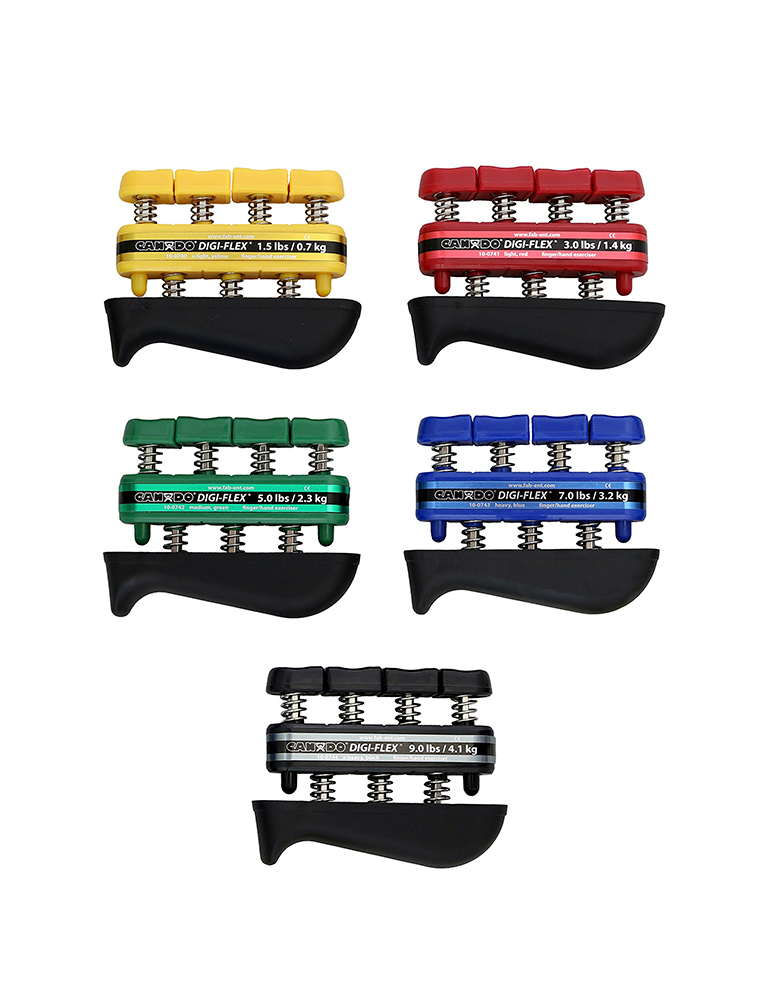 El CanDo Digi-Flex desarrolla la fuerza, la flexibilidad y la coordinación de los dedos aislados a medida que aumenta la fuerza de la mano y el antebrazo. Cada botón de dedo puede bloquearse individualmente. Cada botón tiene un solo resorte que está cubierto por una funda de plástico. Use cada botón de forma independiente para ejercitar los dedos o comprima toda la unidad para fortalecer completamente la mano y el antebrazo. La resistencia progresiva codificada por colores proporciona una respuesta positiva al paciente.