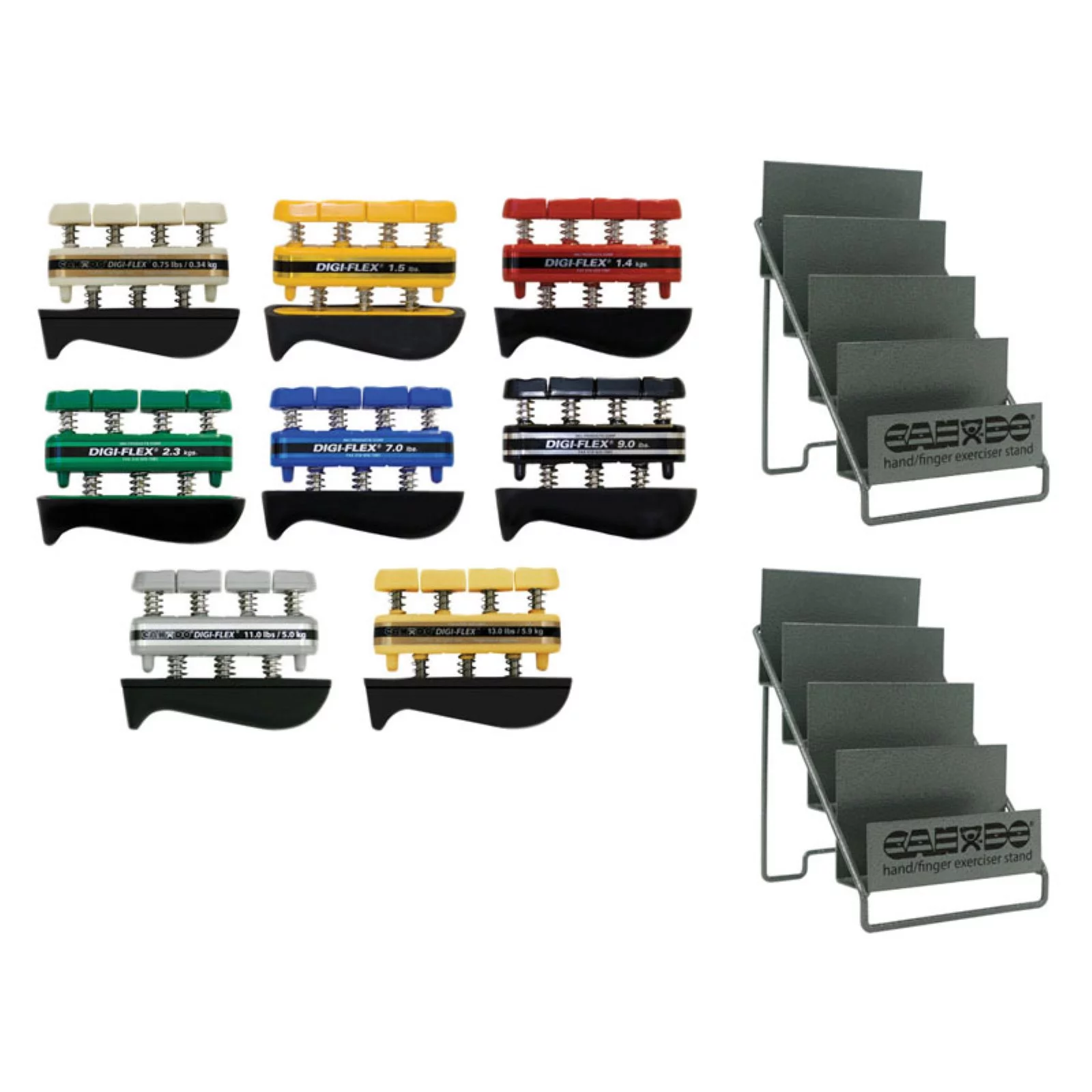 El CanDo Digi-Flex desarrolla la fuerza, la flexibilidad y la coordinación de los dedos aislados a medida que aumenta la fuerza de la mano y el antebrazo. Cada botón de dedo puede bloquearse individualmente. Cada botón tiene un solo resorte que está cubierto por una funda de plástico. Use cada botón de forma independiente para ejercitar los dedos o comprima toda la unidad para fortalecer completamente la mano y el antebrazo. La resistencia progresiva codificada por colores proporciona una respuesta positiva al paciente.