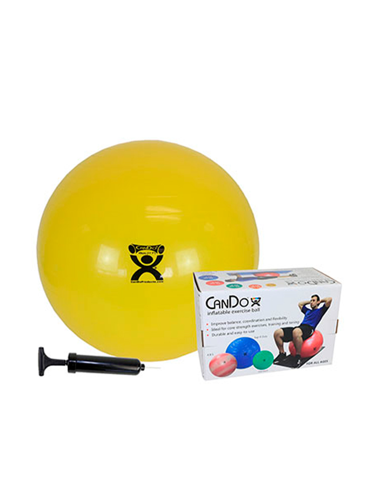 Las pelotas de ejercicio se utilizan para mejorar el equilibrio, la coordinación, la flexibilidad, la fuerza e incluso solo para divertirse. Las pelotas se utilizan como ayuda para el movimiento vestibular y la terapia de equilibrio, los profesionales del acondicionamiento físico como ayuda para los programas de estiramiento y fuerza, como asientos e incluso para las mujeres embarazadas en las clases de parto. Las bolas CanDo tienen una superficie de vinilo de PVC antideslizante que está acanalada para mayor seguridad. Las pelotas pueden estar infladas «por debajo» para dar una sensación suave y blanda o completamente infladas para una sensación firme y rebotante. Las pelotas inflables CanDo estándar pueden soportar hasta 300 libras (136 kg) y están disponibles en una bolsa de plástico o en una caja para minoristas. Disponible en varios tamaños.